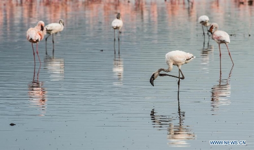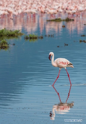 A flamingo looks for food in the lake Bogoria in Kenya's Rift Valley Province which is a little north of the equator, Aug. 10, 2013. Every year Flamingos in Kenya migrate between lake Nakuru, lake Naivasha and lake Bogoria to find abundant cyanobacteria to feed on. (Xinhua/Zhang Chen)