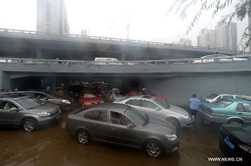 Traffic jam caused by heavy rainfall is seen in Shenyang, capital of Northeast China's Liaoning Province, August 16, 2013. Shenyang was hit by a rainstorm on Friday.(Xinhua/Li Gang)