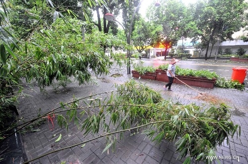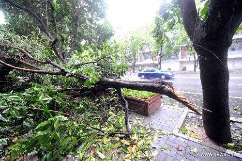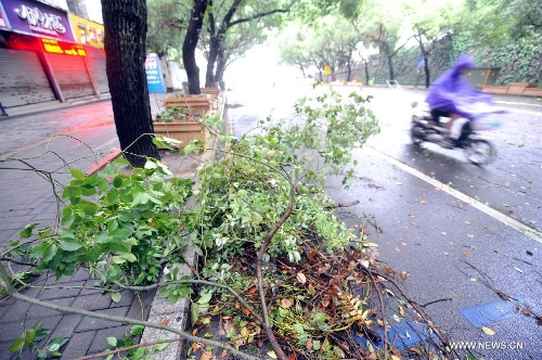 Photo taken on Aug. 22, 2013 shows tree branches tore off by wind at Gulou District in Fuzhou City, capital of Southeast China's Fujian Province. Trami, the 12th tropical storm hitting China this year, landed at 2:40 am in Fuqing City of the province, packing strong winds of 35 meters per second at the storm center, according to the Fujian provincial meteorological observatory. (Xinhua/Peng Zhangqing)