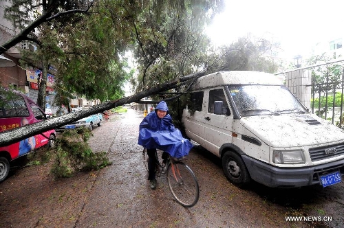 A man rides by trees blew down by wind in Fuzhou City, capital of Southeast China's Fujian Province, Aug. 22, 2013. Trami, the 12th tropical storm hitting China this year, landed at 2:40 am in Fuqing City of the province, packing strong winds of 35 meters per second at the storm center, according to the Fujian provincial meteorological observatory. (Xinhua/Peng Zhangqing)
