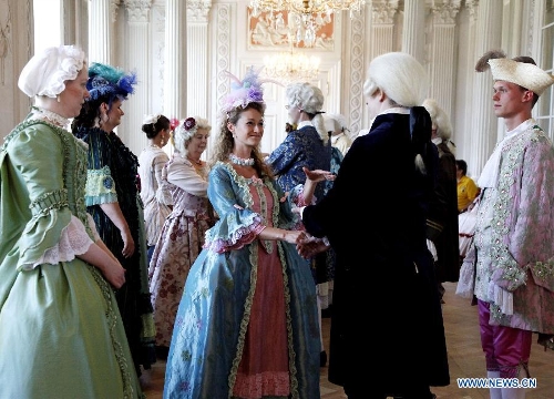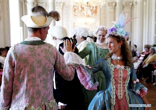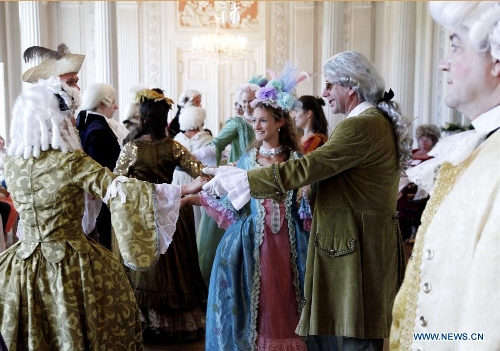 Actors in historic costumes perform in a royal court ball during the Rococo festival at the Friedrichsfelde Palace, Berlin, Germany, Aug. 25, 2013. The Rococo Festival brings back the splendid royal lives and flavors during the reign of Friedrich II, King of Prussia dated back to 18th century. (Xinhua/Pan Xu)