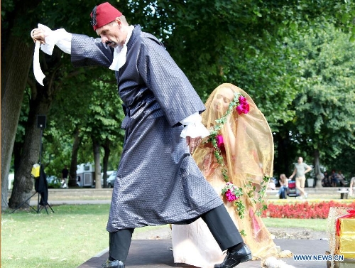 Actors in historic costumes perform during the Rococo festival at the Friedrichsfelde Palace, Berlin, Germany, Aug. 25, 2013. The Rococo Festival brings back the splendid royal lives and flavors during the reign of Friedrich II, King of Prussia dated back to 18th century. (Xinhua/Pan Xu)