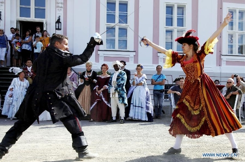 A pair of actors perform the royal fencing during the Rococo festival at the Friedrichsfelde Palace, eastern Berlin, Germany, Aug. 25, 2013. The Rococo Festival brings back the splendid royal lives and flavors during the reign of Friedrich II, King of Prussia dated back to 18th century. (Xinhua/Pan Xu)