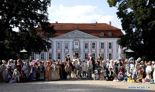 Actors in the Rococo Festival present themselves in flamboyant costumes on the square of the Friedrichsfelde Palace, Berlin, Germany, Aug. 25, 2013. The Rococo Festival brings back the splendid royal lives and flavors during the reign of Friedrich II, King of Prussia dated back to 18th century. (Xinhua/Pan Xu)