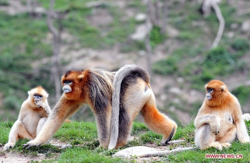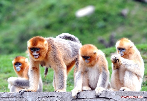 Wild golden monkeys are seen at the Qinling Mountains in Yangxian County, Northwest China's Shaanxi Province, Aug. 26, 2013. The number of wild golden monkeys at the Qinling Mountains in Yangxian County has increased by 30 since the beginning of 2013. Like the giant panda, the monkeys are counted among China's "national treasures" and placed under top state protection. (Xinhua/Chen Haining)