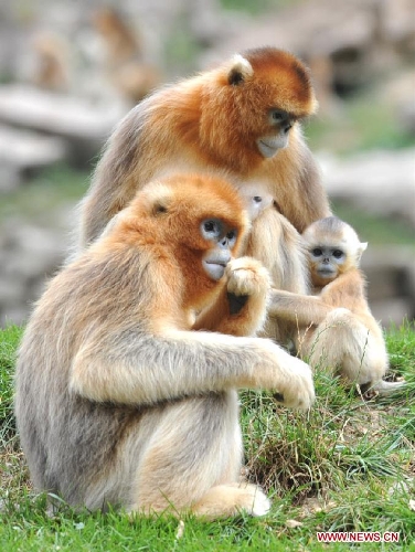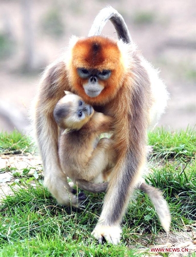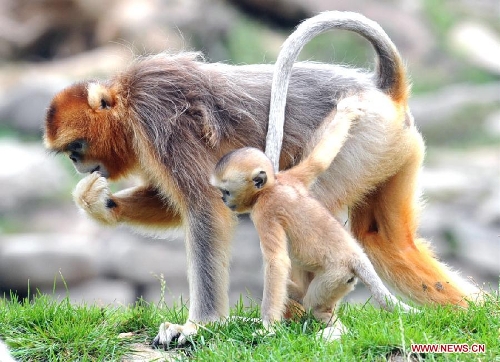 A wild golden monkey is seen with its baby at the Qinling Mountains in Yangxian County, Northwest China's Shaanxi Province, Aug. 26, 2013. The number of wild golden monkeys at the Qinling Mountains in Yangxian County has increased by 30 since the beginning of 2013. Like the giant panda, the monkeys are counted among China's "national treasures" and placed under top state protection. (Xinhua/Chen Haining)