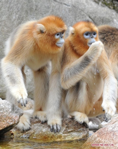 Two wild golden monkeys eat food at the Qinling Mountains in Yangxian County, Northwest China's Shaanxi Province, Aug. 26, 2013. The number of wild golden monkeys at the Qinling Mountains in Yangxian County has increased by 30 since the beginning of 2013. Like the giant panda, the monkeys are counted among China's "national treasures" and placed under top state protection. (Xinhua/Chen Haining)