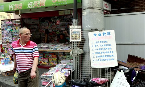 As business becomes sluggish, some newsstands are displaying large posters, like this one advertising mortgage deals, to make extra money. Photo: Yang Hui/GT