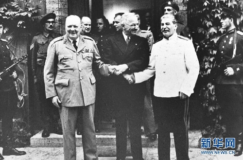 File photo shows Winston Churchill (L), Harry S. Truman (C) and Joseph Stalin (R) at the Potsdam Conference in July 1945. The Potsdam Declaration, which outlined the terms of surrender for Japan during World War II in Asia, was issued on July 26, 1945. (Source: xinhuanet.com/photo)