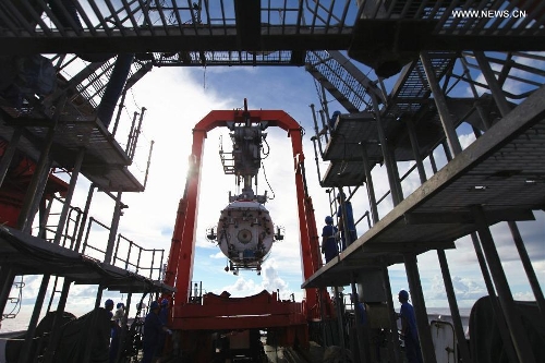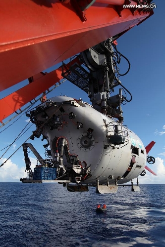 China's manned submersible Jiaolong returns to its support ship, the Xiangyanghong-09 at Pacific Ocean, Sept. 3, 2013. Jiaolong and its support ship the Xiangyanghong-09 are on a scientific research voyage focusing on polymetallic nodules in the northeast Pacific and cobalt-rich crusts in the northwest Pacific. (Xinhua/Yu Xiaojie)
