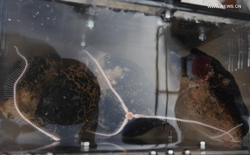 Photo taken on Sept. 3, 2013 shows the rocks and leptasteria collected by China's manned submersible Jiaolong during its 69th diving of scientific research in the Pacific. Jiaolong and its support ship the Xiangyanghong-09 are on a scientific research voyage focusing on polymetallic nodules in the northeast Pacific and cobalt-rich crusts in the northwest Pacific. (Xinhua/Yu Xiaojie)