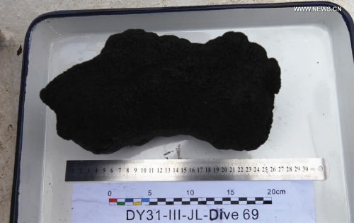Photo taken on Sept. 3, 2013 shows the cobalt-rich crusts collected by China's manned submersible Jiaolong during its 69th diving of scientific research in the Pacific. Jiaolong and its support ship the Xiangyanghong-09 are on a scientific research voyage focusing on polymetallic nodules in the northeast Pacific and cobalt-rich crusts in the northwest Pacific. (Xinhua/Yu Xiaojie)