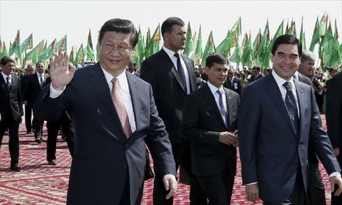 Chinese President Xi Jinping (L front) and his Turkmenian counterpart Gurbanguly Berdymukhamedov attend the ceremony of inaugurating the No. 1 processing plant of the Fuxing Gas Field in Mary, Turkmenistan, Sept. 4, 2013. Photo: Xinhua