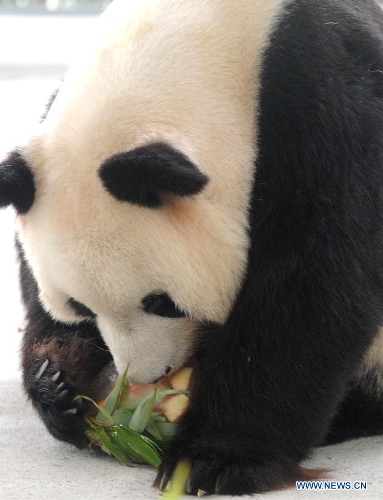 Giant panda Xin Yue has a meal in the Taihu Lake National Wetland Park in Suzhou, east China's Jiangsu Province, Sept. 7, 2013. Zhu Yun and Xin Yue, two giant pandas coming from southwest China's Sichuan Province, embraced their two years' anniversary for living in Suzhou on Saturday. (Xinhua/Hang Xingwei)