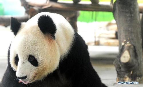 Giant panda Zhu Yun rests in the Taihu Lake National Wetland Park in Suzhou, east China's Jiangsu Province, Sept. 7, 2013. Zhu Yun and Xin Yue, two giant pandas coming from southwest China's Sichuan Province, embraced their two years' anniversary for living in Suzhou on Saturday. (Xinhua/Hang Xingwei)