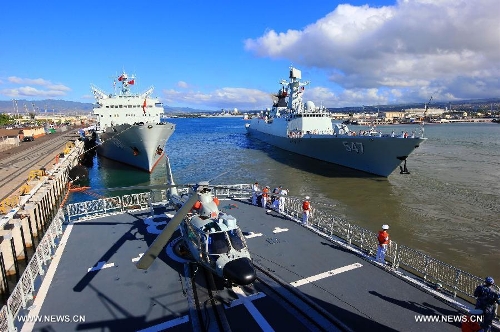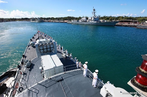 A naval fleet of the Chinese People's Liberation Army (PLA), which is comprised of the missile destroyer Qingdao, missile frigate Linyi and supply ship Hongzehu, leaves after a three-day friendly visit to Hawaii, at the Pearl Harbor in Hawaii, the United States, Sept. 9, 2013. (Xinhua/Zha Chunming)