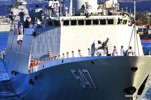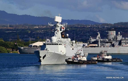 Chinese Navy's missile frigate Linyi leaves the Pearl Harbor in Hawaii, the United States, Sept. 9, 2013. A naval fleet of the Chinese People's Liberation Army (PLA), which is comprised of the missile destroyer Qingdao, missile frigate Linyi and supply ship Hongzehu, wrapped up a three-day friendly visit to Hawaii on Monday. (Xinhua/Zha Chunming)