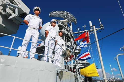 Chinese marines stand aboard the missile destroyer Qingdao as the fleet left the Pearl Harbor in Hawaii, the United States, Sept. 9, 2013. A naval fleet of the Chinese People's Liberation Army (PLA), which is comprised of the missile destroyer Qingdao, missile frigate Linyi and supply ship Hongzehu, wrapped up a three-day friendly visit to Hawaii on Monday. (Xinhua/Zha Chunming)