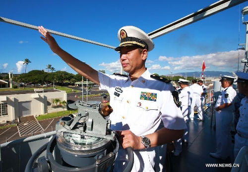 Commander of the Chinese naval fleet Wei Gang waves as the fleet left the Pearl Harbor in Hawaii, the United States, Sept. 9, 2013. A naval fleet of the Chinese People's Liberation Army (PLA), which is comprised of the missile destroyer Qingdao, missile frigate Linyi and supply ship Hongzehu, wrapped up a three-day friendly visit to Hawaii on Monday. (Xinhua/Zha Chunming)