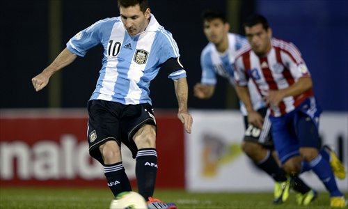 Lionel Messi of Argentina scored a penalty kick against Paraguay on Tuesday. Photo: AFP