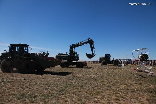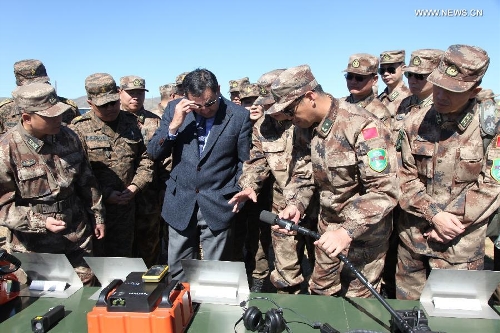Mongolian side visit Chinese rescue equipment during the opening of a joint training for natural disaster relief at a training center in Tavan Tolgoi, Mongolia, Sept. 16, 2013. Chinese and Mongolian armed forces on Monday kicked off joint training for natural disaster relief. The eight-day training, code-named "Prairie Pioneer," features joint training courses, discussion forums, simulation and field exercises. (Xinhua/Wang Ning)