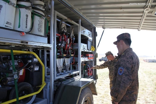 Mongolian soldiers visit Chinese rescue equipment during the opening of a joint training for natural disaster relief at a training center in Tavan Tolgoi, Mongolia, Sept. 16, 2013. Chinese and Mongolian armed forces on Monday kicked off joint training for natural disaster relief. The eight-day training, code-named "Prairie Pioneer," features joint training courses, discussion forums, simulation and field exercises. (Xinhua/Wang Ning)