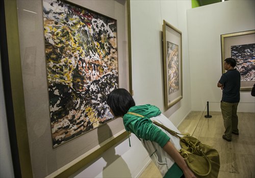 Lin Xiangxiong (top) blends abstraction, traditional painting techniques and modern social commentary in his art (below), which is on display at the National Art Museum of China until Tuesday. Photos: Li Hao/GT