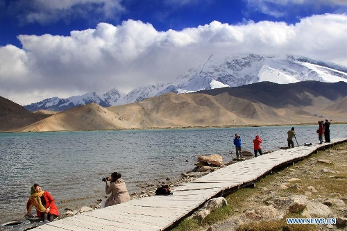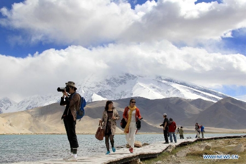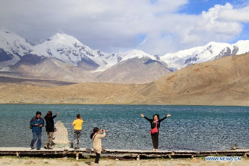 Tourists take photos beside the Karakol Lake at the foot of Mount Muztagata in the west of Xinjiang Uygur Autonomous Region, northwest China, Sept. 15, 2013. The Karakol Lake covers an area of 10 square kilometers, with an altitude of 3,600 meters and an average depth of over 30 meters. (Xinhua/Cai Zengle)