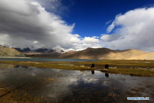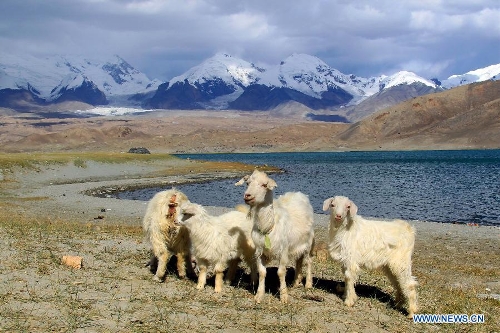 Goats are seen beside the Karakol Lake at the foot of Mount Muztagata in the west of Xinjiang Uygur Autonomous Region, northwest China, Sept. 15, 2013. The Karakol Lake covers an area of 10 square kilometers, with an altitude of 3,600 meters and an average depth of over 30 meters. (Xinhua/Cai Zengle)