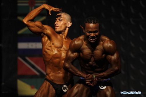 Edgar Pineda (L) fo El Salvador and Geshaune Clarke (R) of Anguilla compete in the XLI Central American and Caribbean Bodybuilding and Fitness Championship in Santo Domingo of the Dominican Republic, on Sept. 22, 2013. Delegations from 29 countries and regions participated in the championship. (Xinhua/Roberto Guzman)