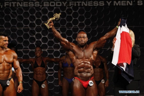 Bodybuilder Rafael Cabrera of the Dominican Republic celebrates his first place of the 85kg category in the XLI Central American and Caribbean Bodybuilding and Fitness Championship in Santo Domingo of the Dominican Republic, on Sept. 22, 2013. Delegations from 29 countries and regions participated in the championship. (Xinhua/Roberto Guzman)