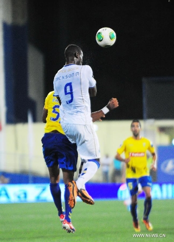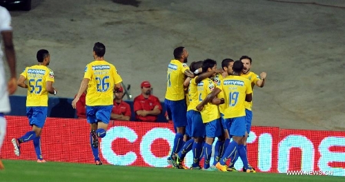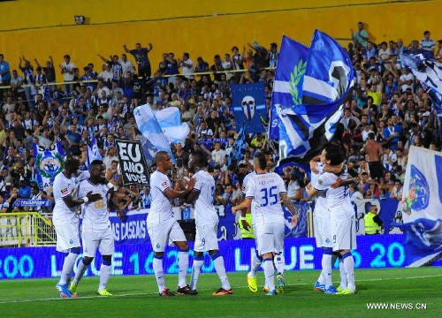 Players of Estoril celebrate scoring during the Portuguese league football match between Estoril and FC Porto at the Antonio Coimbra da Mota stadium in Estoril on September 22, 2013. The game ended in a draw 2-2. (Xinhua/Zhang Liyun)