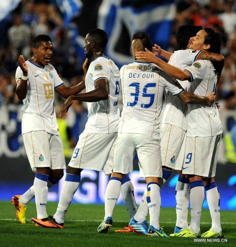 Players of FC Porto celebrate scoring during the Portuguese league football match between Estoril and FC Porto at the Antonio Coimbra da Mota stadium in Estoril on September 22, 2013. The game ended in a draw 2-2. (Xinhua/Zhang Liyun)
