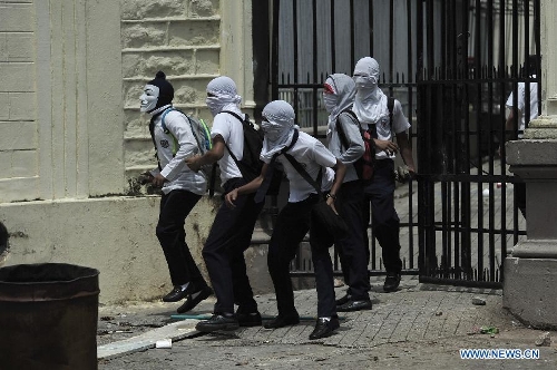 Middle school students clash with members of the national police during a protest in the National Institute, in Panama city, Panama, on Sept. 23, 2013. Students from the National Institute participated in a protest demanding the resignation of the Education Minister Lucy Molinar for the destitution of two students detained in previous protests, according to the local press. (Xinhua/Mauricio Valenzuela)