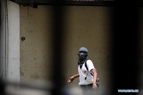 A middle school student clashes with members of the national police during a protest in the National Institute, in Panama city, Panama, on Sept. 23, 2013. Students from the National Institute participated in a protest demanding the resignation of the Education Minister Lucy Molinar for the destitution of two students detained in previous protests, according to the local press. (Xinhua/Mauricio Valenzuela)