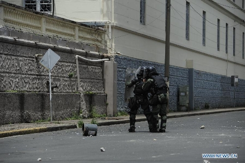 Elements of the national police clash with middle school students during a protest in the National Institute, in Panama city, Panama, on Sept. 23, 2013. Students from the National Institute participated in a protest demanding the resignation of the Education Minister Lucy Molinar for the destitution of two students detained in previous protests, according to the local press. (Xinhua/Mauricio Valenzuela)