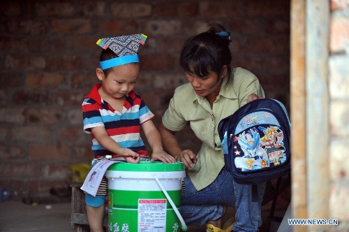 Four-year-old Luo Rong learns Chinese characters on a paint bucket in Donghe Village of Baise City, Southwest China's Guangxi Zhuang Autonomous Region, Sept. 16, 2013. Urban villages, or "villages in cities", are usually inhabited by poor people and migrants. The tough living conditions there make it difficult for children of migrant workers' families to pursue education. Despite the short physical distance from city, their study environments fall far behind from those in urban areas. Their dream is to live and study just like children living in cities. (Xinhua/Huang Xiaobang)