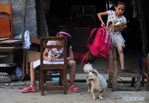 Seven-year-old Pan Simei (L) writes homework with her friends on a desk donated by charity in Baisha Village of Liuzhou City, Southwest China's Guangxi Zhuang Autonomous Region, Sept. 11, 2013. Urban villages, or "villages in cities", are usually inhabited by poor people and migrants. The tough living conditions there make it difficult for children of migrant workers' families to pursue education. Despite the short physical distance from city, their study environments fall far behind from those in urban areas. Their dream is to live and study just like children living in cities. (Xinhua/Huang Xiaobang)