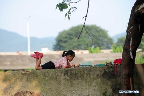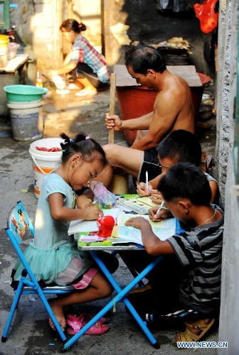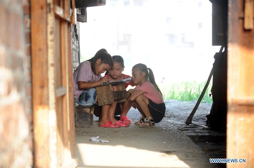 Girls from southwest China's Guizhou Province write homework on a wooden bench at Baisha Village of Liuzhou City, Southwest China's Guangxi Zhuang Autonomous Region, Aug. 28, 2013. Urban villages, or "villages in cities", are usually inhabited by poor people and migrants. The tough living conditions there make it difficult for children of migrant workers' families to pursue education. Despite the short physical distance from city, their study environments fall far behind from those in urban areas. Their dream is to live and study just like children living in cities. (Xinhua/Zhou Hua)
