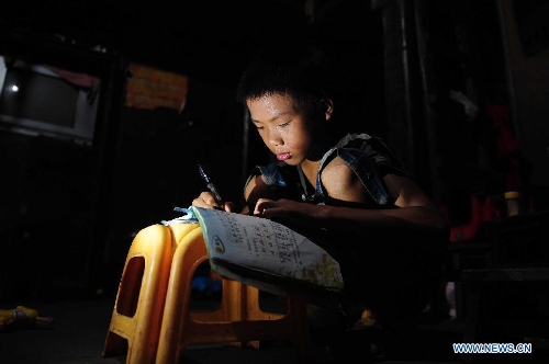 Fourth grade student Zhang Fu'an squats to write homework on a stool at a muggy room in Baisha Village of Liuzhou City, Southwest China's Guangxi Zhuang Autonomous Region, Sept. 11, 2013. Urban villages, or "villages in cities", are usually inhabited by poor people and migrants. The tough living conditions there make it difficult for children of migrant workers' families to pursue education. Despite the short physical distance from city, their study environments fall far behind from those in urban areas. Their dream is to live and study just like children living in cities. (Xinhua/Zhou Hua)