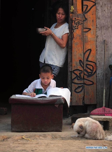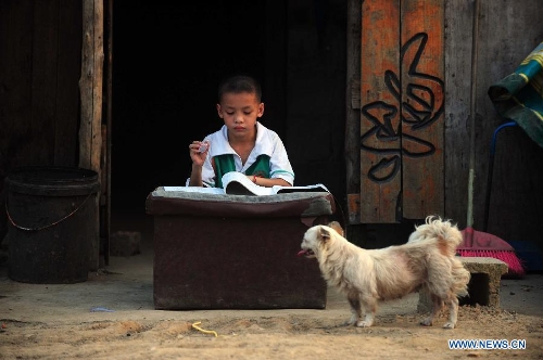Eight-year-old Yang Peng writes homework at a settlement for migrant workers in Donghe Village of Baise City, Southwest China's Guangxi Zhuang Autonomous Region, Sept. 16, 2013. Urban villages, or "villages in cities", are usually inhabited by poor people and migrants. The tough living conditions there make it difficult for children of migrant workers' families to pursue education. Despite the short physical distance from city, their study environments fall far behind from those in urban areas. Their dream is to live and study just like children living in cities. (Xinhua/Zhang Ailin)
