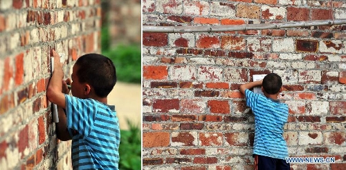 Combined photo taken on May 23, 2013 shows 12-year-old Zhang Bin writing homework against the wall at Baisha Village in Liuzhou City, Southwest China's Guangxi Zhuang Autonomous Region. Urban villages, or "villages in cities", are usually inhabited by poor people and migrants. The tough living conditions there make it difficult for children of migrant workers' families to pursue education. Despite the short physical distance from city, their study environments fall far behind from those in urban areas. Their dream is to live and study just like children living in cities. (Xinhua/Zhang Ailin)