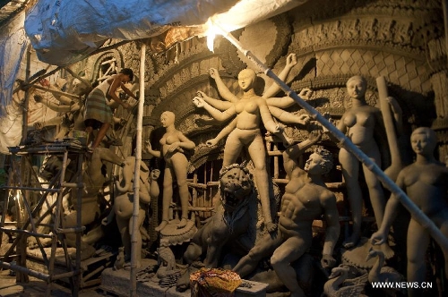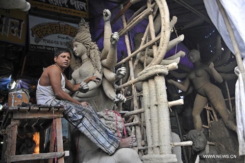 An Indian artist makes clay idols of Goddess Durga for the upcoming Durga Puja festival at Kumartuly in Calcutta, capital of eastern Indian state West Bengal, Sept. 25, 2013. The largest Hindu festival, Durga Puja is widely celebrated in east India and Nepal to worship Goddess Durga, a symbol of power and the triumph of good over evil. (Xinhua/Tumpa Mondal)