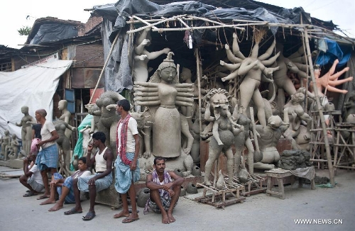 Indian labors rest during the making of clay idols of Goddess Durga for the upcoming Durga Puja festival at Kumartuly in Calcutta, capital of eastern Indian state West Bengal, Sept. 25, 2013. The largest Hindu festival, Durga Puja is widely celebrated in east India and Nepal to worship Goddess Durga, a symbol of power and the triumph of good over evil. (Xinhua/Tumpa Mondal)