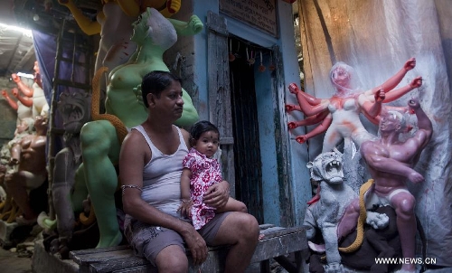An Indian artist sits with his girl during the making of clay idols of Goddess Durga for the upcoming Durga Puja festival at Kumartuly in Calcutta, capital of eastern Indian state West Bengal, Sept. 25, 2013. The largest Hindu festival, Durga Puja is widely celebrated in east India and Nepal to worship Goddess Durga, a symbol of power and the triumph of good over evil. (Xinhua/Tumpa Mondal)