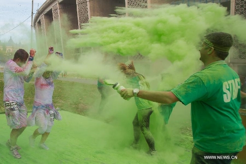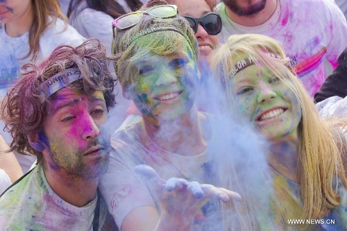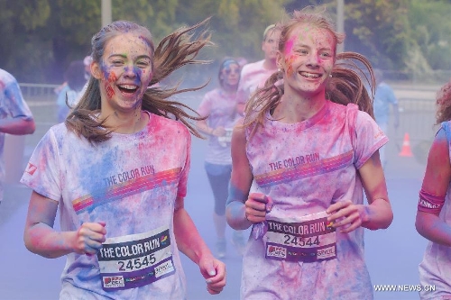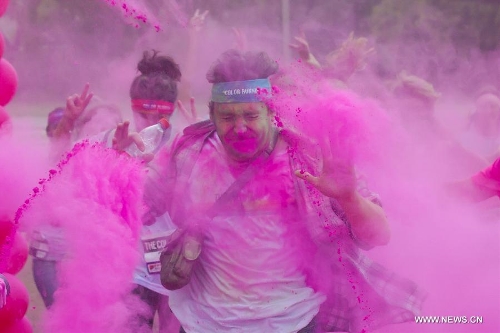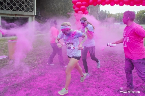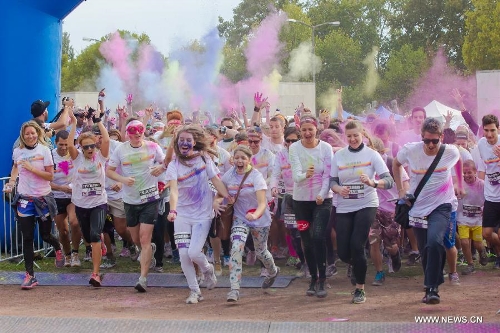 Runners take part in the Color Run in Budapest, capital of Hungary, Sept. 29, 2013. The Color Run is a five-kilometer paint race, which is also a charity event in support of Hungary's Peto Institute child rehabilitation center. Partipants were showered with colored powders at stations in the race. This was the first Color Run held in Hungary. (Xinhua/Attila Volgyi)