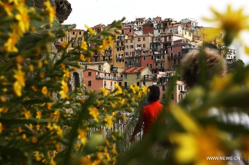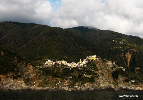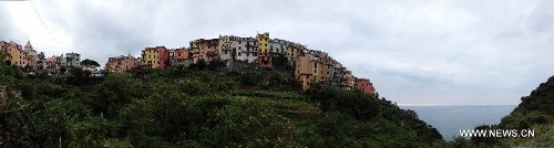 Photo taken on Sept. 27, 2013 shows a view of Corniglia in Cinque Terre of Italy. The Cinque Terre meaning five towns indicates Riomaggiore, Manarola, Corniglia, Vernazza and Monterosso located from south to north on Ligurian coast. The layout and disposition of the small towns and the shaping of the surrounding landscape, overcoming the disadvantages of a steep, uneven terrain, encapsulate the continuous history of human settlement in this region over the past millennium. In 1997 Porto Venere and the villages of Cinque Terre were designated by UNESCO as a World Heritage Site. (Xinhua/Du Juanjuan)