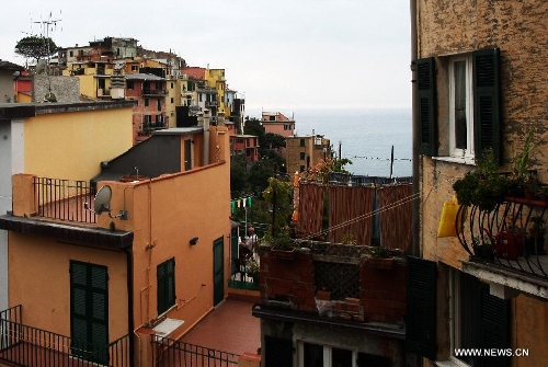 Photo taken on Sept. 27, 2013 shows a view of Riomaggiore of Cinque Terre of Italy. The Cinque Terre meaning five towns indicates Riomaggiore, Manarola, Corniglia, Vernazza and Monterosso located from south to north on Ligurian coast. The layout and disposition of the small towns and the shaping of the surrounding landscape, overcoming the disadvantages of a steep, uneven terrain, encapsulate the continuous history of human settlement in this region over the past millennium. In 1997 Porto Venere and the villages of Cinque Terre were designated by UNESCO as a World Heritage Site. (Xinhua/Du Juanjuan)