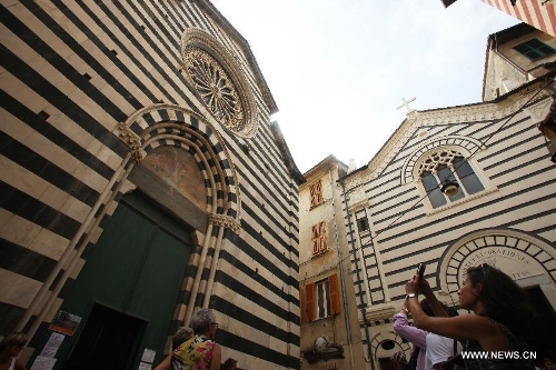 Tourists take photos of churchs in Monterosso of Cinque Terre in Italy, on Sept. 28, 2013. The Cinque Terre meaning five towns indicates Riomaggiore, Manarola, Corniglia, Vernazza and Monterosso located from south to north on Ligurian coast. The layout and disposition of the small towns and the shaping of the surrounding landscape, overcoming the disadvantages of a steep, uneven terrain, encapsulate the continuous history of human settlement in this region over the past millennium. In 1997 Porto Venere and the villages of Cinque Terre were designated by UNESCO as a World Heritage Site. (Xinhua/Du Juanjuan)