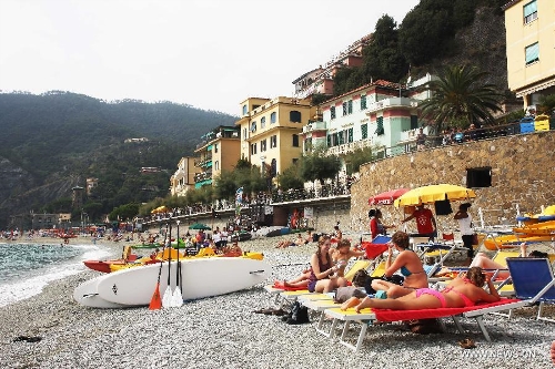 Tourists enjoy sunshine in Monterosso of Cinque Terre in Italy, on Sept. 28, 2013. The Cinque Terre meaning five towns indicates Riomaggiore, Manarola, Corniglia, Vernazza and Monterosso located from south to north on Ligurian coast. The layout and disposition of the small towns and the shaping of the surrounding landscape, overcoming the disadvantages of a steep, uneven terrain, encapsulate the continuous history of human settlement in this region over the past millennium. In 1997 Porto Venere and the villages of Cinque Terre were designated by UNESCO as a World Heritage Site. (Xinhua/Du Juanjuan)